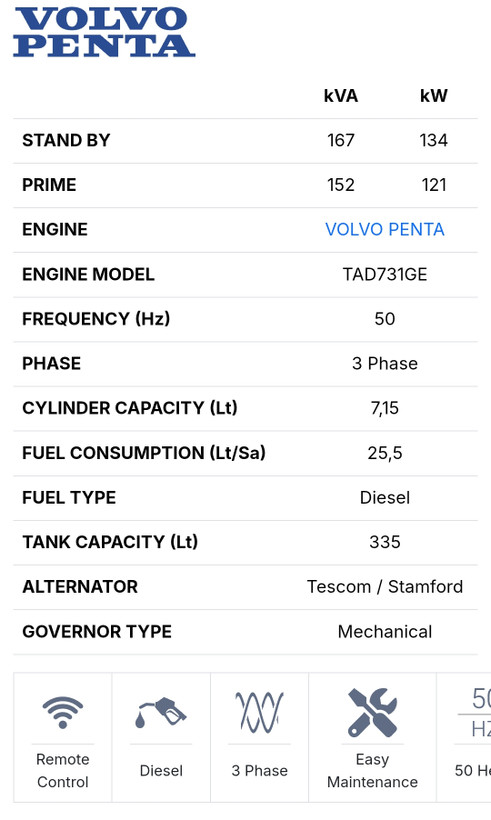 سایر قابلیت های دیزل ژنراتور ولوو پنتا ۱۶۷ کاوا