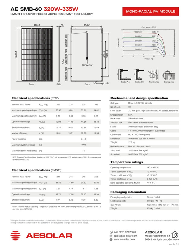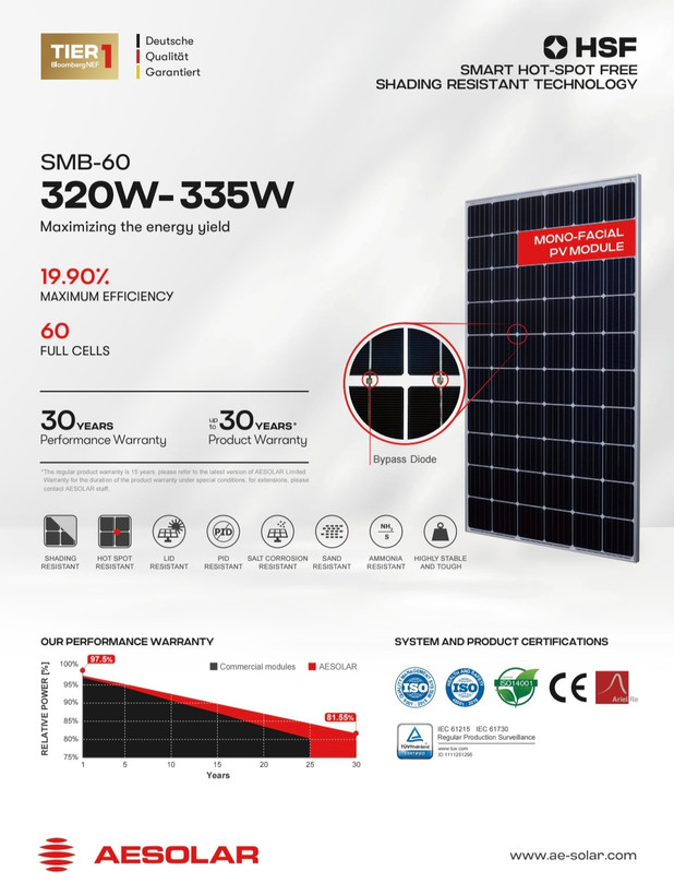 پنل خورشیدی 330 وات برند AE SOLAR از سلول های پلی کریستال تشکیل شده و جزو پنل های 72 سلولی است.