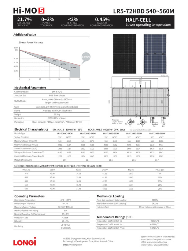 - مشخصات کلی پنل خورشیدی 550 وات برند LONGiراندمان ۲۱.۳ درصد