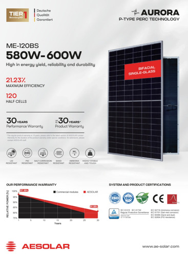 پنل خورشیدی 580 وات مونو کریستال بایفشیال برند AE SOLAR